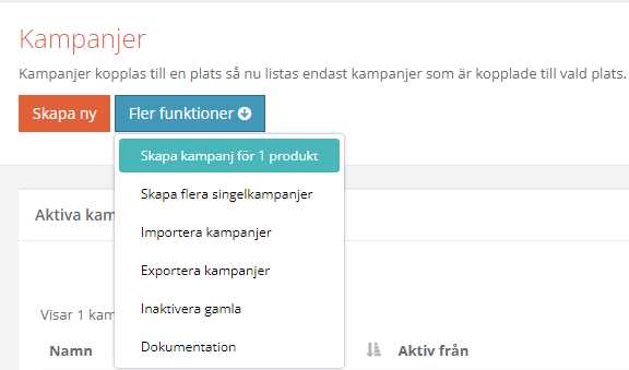 Klicka på "Skapa ny" (Se bild). Här ser du även aktiva kampanjer. Ifall du vill se inaktiva kampanjer så behöver du klicka på pilen längst till höger på blocket "Inaktiva kampanjer" (Se bild)
