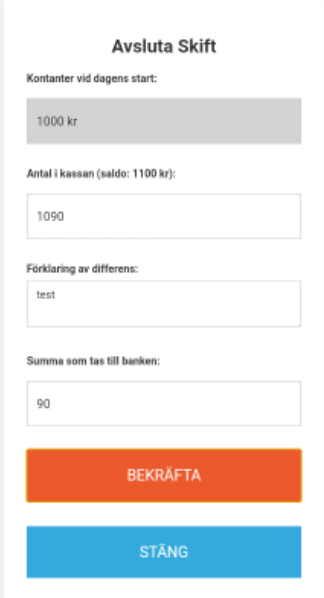 I fältet "Summa som tas till banken" ska det belopp som man plockar ur kassan anges. Det ska anges som ett positivt tal. I nedanstående exempel tas 90kr ut ur kassan och tas till banken.