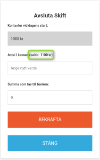 Då kommer en dialogruta enligt följande. I exemplet nedan har det registrerats 1000 kr i kassan, "kontanter vid dagens start". Sedan har kontanta köp gjorts med en total summa om 100 kr. Det innebär att det nu ska finnas 1100 kr i kassan. (saldo)