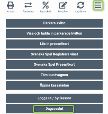 Tryck på de tre strecken i högra hörnet - Dagsavslut