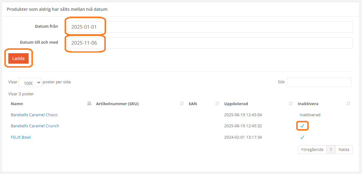 Lämpligen välj ett datumintervall från årsskiftet eller 6 månader bakåt i tiden fram till dagens datum. Produkter som visas har då inte sålts på väldigt länge och kan lämpligen inaktiveras.
