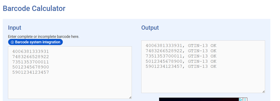Här klistrar ni in streckkoderna enligt bilden nedan & trycker ”validate” för att se att dom är giltiga streckkoder.