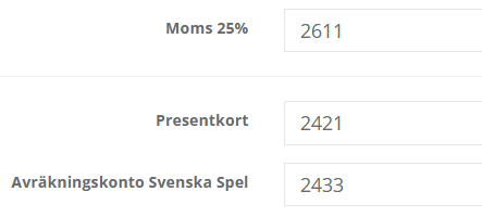 Börja med att fylla i det bokföringskonto som ni vill använda för presentkort, under Företagsinställningar - Bokföring. T.ex. 2421. Om ni inte ser Presentkort maila oss vilket konto så lägger vi till det.