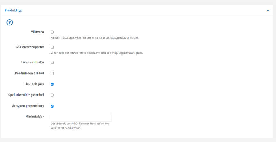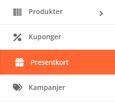 Dessa produkter är av typen ”Presentkort” under Produkttyp. Det är också fördelaktigt (men inte tvingande) att sätta produkten till typen ”Flexibelt pris”.