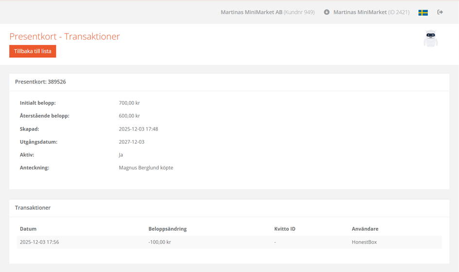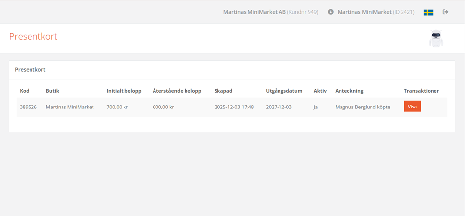 Under "Visa" för ett presentkort kan du se transaktioner för ett specifikt presentkort