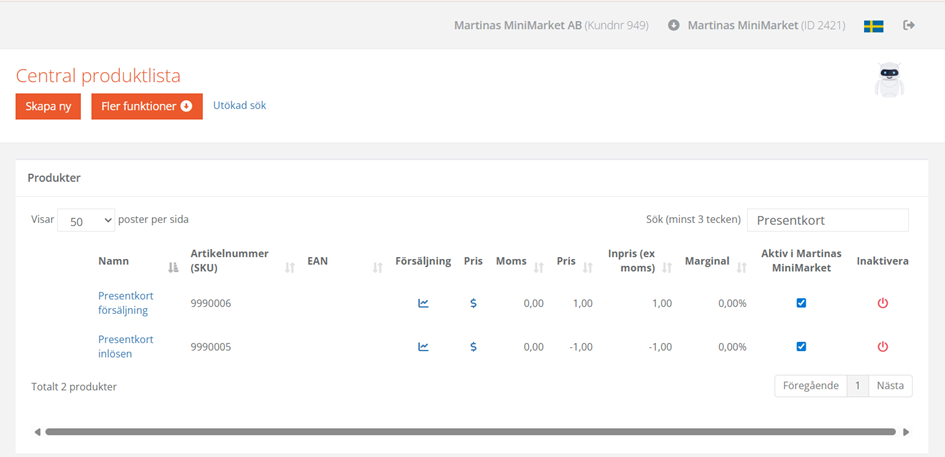 Två standardartiklar för användning med presentkort kommer att skapas upp med automatik. Se nedan: