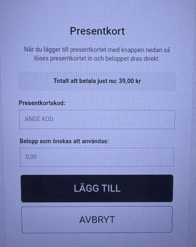 Observera att när du lägger till presentkortet med knappen nedan så löses presentkortet in och beloppet dras direkt.
